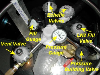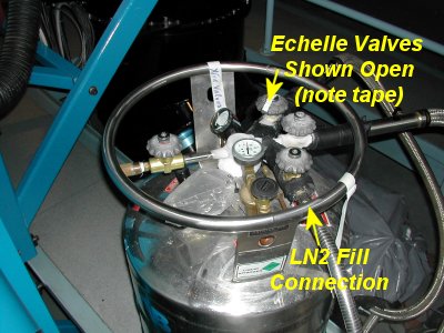 - Roll the 180L LN2 dewar over to the Echelle but DO NOT connect the Liquid line to the fitting on the Echelle tank yet.
