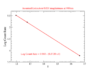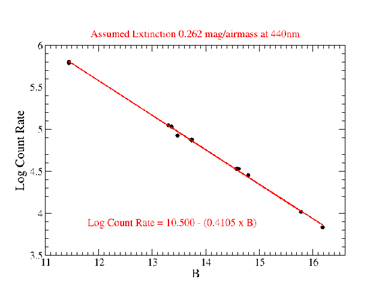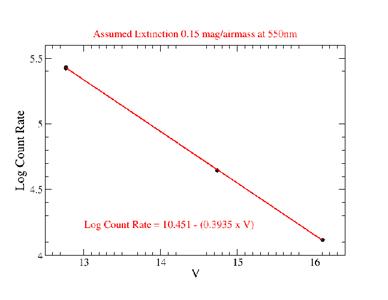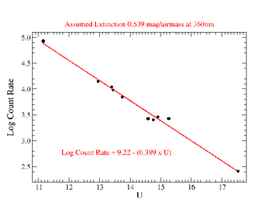 We observed standard stars using Agile with the Johnson U, B, V, R, and I filters in photometric weather. We thank the observers who gave some of their telescope time to achieve the throughput measurements indicated below, especially Chas Miller and Eric Hilton. Since we did not acquire these measurements at zenith, we have corrected the measured counts for extinction. We show our measurements in Figure 5 and clearly indicate the assumed extinction values employed in the correction for different filters with different effective wavelengths. Using the equations of the best fit lines shown in Figure 5, we are able to derive the expected count rates for stars of different magnitudes using the Johnson U, B, V, R, and I filters. We tabulate these values below to help observers estimate an exposure time for a given target. Should the observer decide to use the medium gain setting for example, the values in the table below given in units of electrons/s should be divided by a factor of ≈2 to get an estimate of the actual count rate in units of ADU/s.