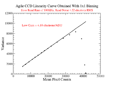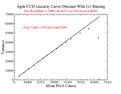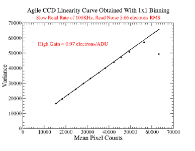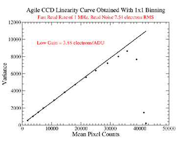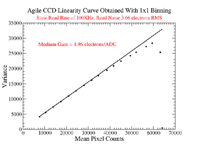Agile has two possible read rates of 1MHz and 100 KHz, and three possible gain settings of high, medium, and low. For each of the six possible combinations as above, we carried out the following process to determine values for the read rate and gain at each setting. We acquired two consecutive domeflats using the dim quartz lamp with increasing exposure times until saturation. We show the mean counts of both the images along the x axis and the variance in the difference of these images along the y axis. These CCD transfer curves obtained with 1x1 binning show the region of linearity (see Figure 1). The inverse of the slope of the linear regime gives us a value of the gain at that setting. At the read rate of 1 MHz, we determine the high, medium, and low gain settings to correspond to values of 0.95, 1.93, and 3.88 electrons/ADU respectively. At the read rate of 100 KHz, we find that the high, medium, and low gain settings correspond to 0.97, 1.96, and 4.10 electrons/ADU respectively.