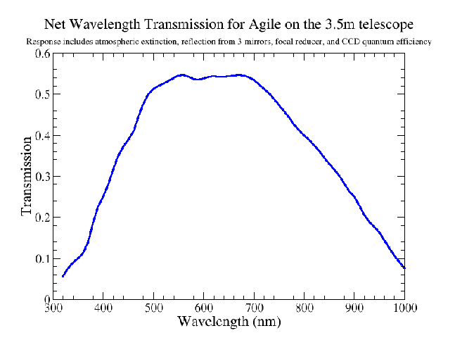 Figure 2 also shows the other components that shape the net wavelength response of Agile. These include the atmospheric transmission, which we actually derived using atmospheric extinction curves for CTIO. We also show the net transmission after reflections off the primary, secondary, and tertiary mirrors of the 3.5m telescope. We generated these curves using reflectivity measurements of the freshly coated 2.5m SDSS mirror. The mirrors of the 3.5m telescope also have aluminium coatings deposited using similar processes.