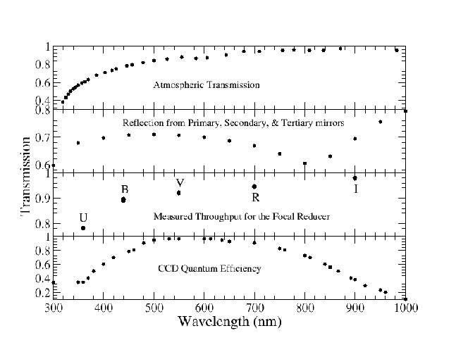 Figure 2: We show the wavelength transmission of individual components relevant when using Agile at the 3.5m telescope. We show the atmospheric transmission (top panel), the net transmission after reflections off the primary, secondary, and tertiary mirrors of the 3.5m telescope (second panel), the throughput transmission of the focal reducer (third panel), and the Agile CCD quantum efficiency in the bottom panel.