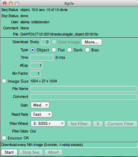 - NOTE: Currently clicking Abort puts the agile Expose GUI into a strange unresponsive state. The Obs-Spec can clear this for you. However, it is important that once the Abort button is clicked no other commands are sent from this window UNTIL the Obs-Spec has cleared it for you. When possible please warn the Obs-Spec when you intend to use the Abort button.