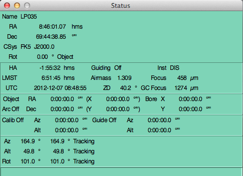 Agile is operated within the Telescope User Interface (TUI) software written and maintained by Russell Owen at the University of Washington. A detailed manual is available at under the top menu Telescope->TUI->Manual. The main TUI status window is shown below.