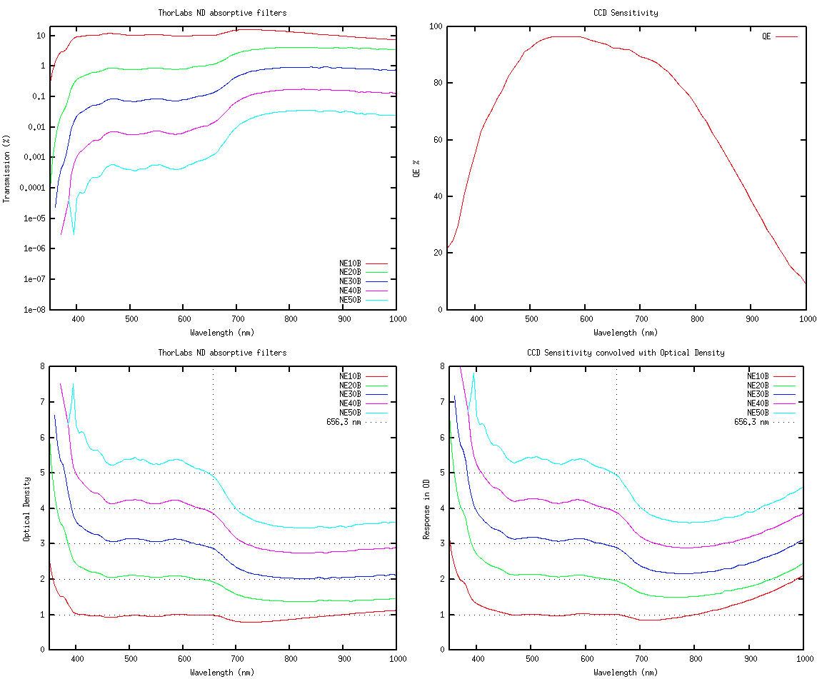 The echelle slitviewer is equipped with five neutral density (ND) filters. These can be used to stop bright objects from saturating in the guide window. For brighter objects, use a higher ND filter.The neutral density filters for the echelle slitviewer are absorptive optical density filters. The amount of fractional transmittance through them at 656.3 nm is equivalent to the negative power of the ND number for that filter. Therefore, ND1 is 0.1 times the transmittance of the clear filter at 656.3 nm. The ND2 filter is 0.01 the transmittance of the clear filter and so forth. The following plots show the response for the guider per wavelength for each of the ND filters when convolved with the QE of the guide camera.