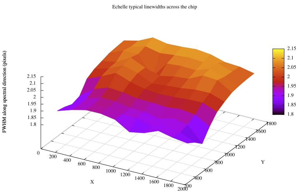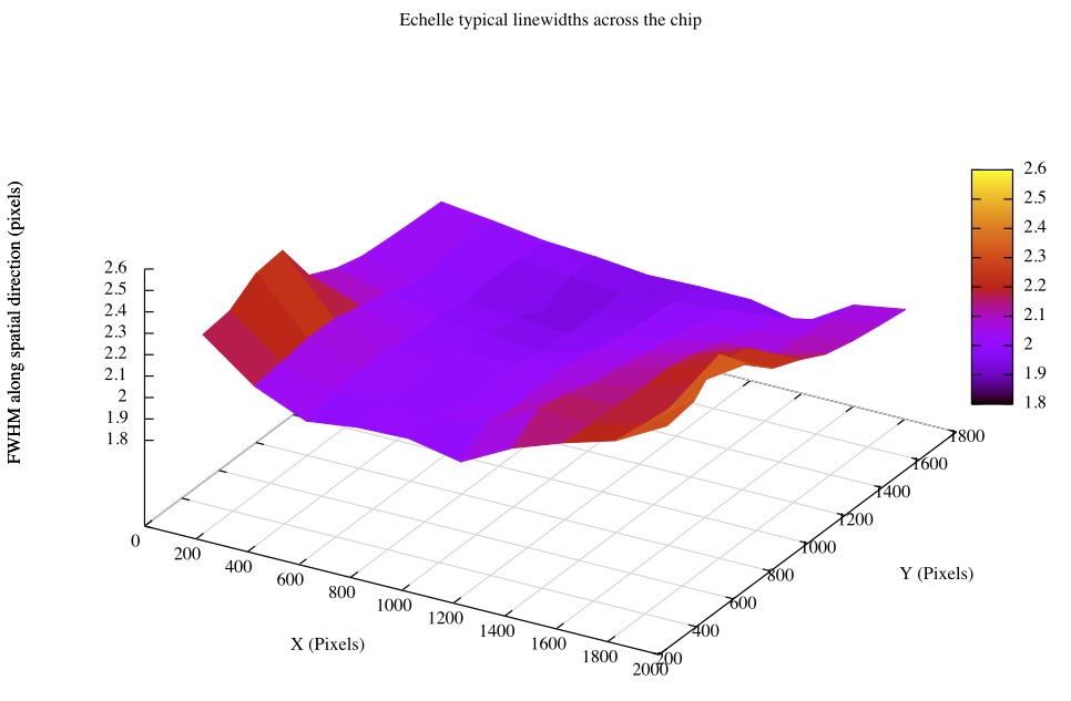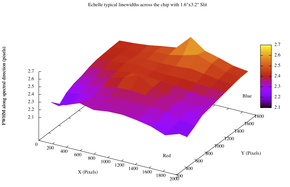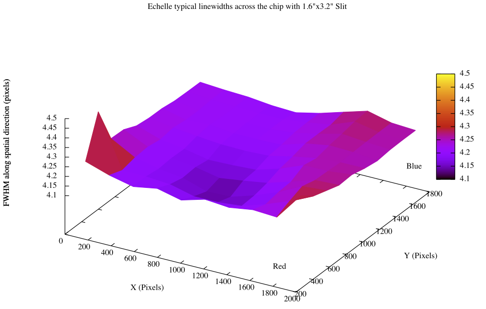 The spectra are recorded in ~120 orders that are distributed across the chip. Longer wavelength orders are located at the bottom (low row numbers) of the chip, and shorter wavelength order are located at higher row numbers. Each order is curved significantly, and within each order, wavelength decreases with increasing row number. Compared with some other echelle spectrographs, the orders are relatively narrow and closely spaced, which may require users to take special care when flat fielding and extracting spectra.