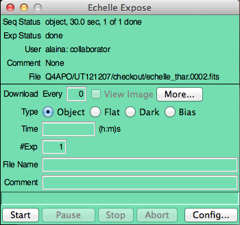 Echelle exposures are taken using the Expose window which is opened using the Expose button in the Echelle configuration window. The Expose gui looks like: