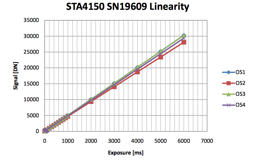 The CCD is linear (within 1%) up to saturation, i.e. the full range of the A/D converter. The following plot demonstrantes this performance. Each line (OS 1-4) represents one of the four readout amplifiers on the chip.
