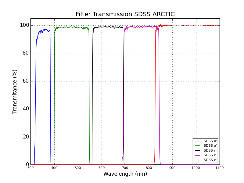 Below is a plot of the SDSS filter bandpasses and transmission for the available 130mm set.
