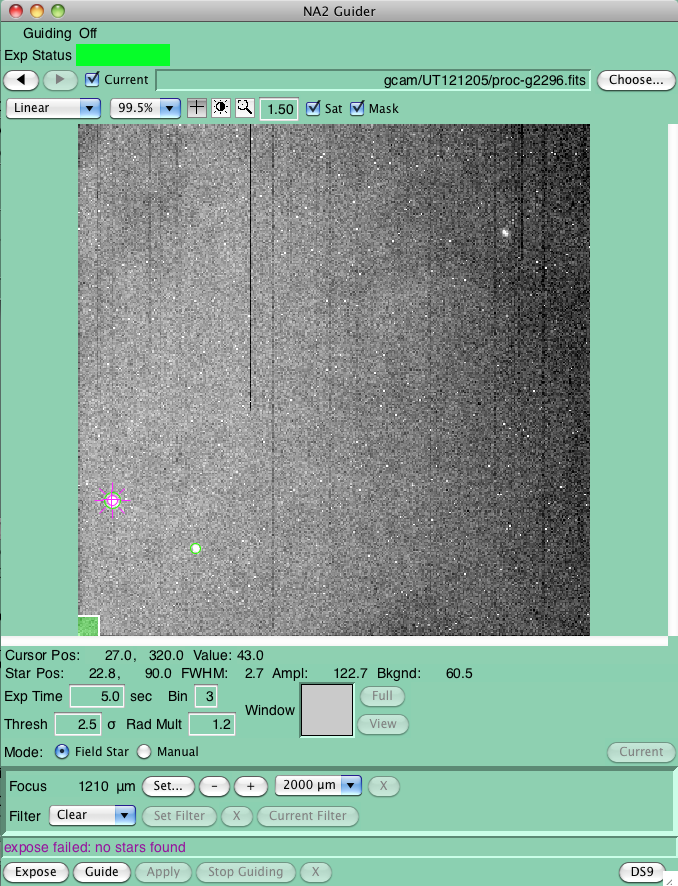 Guiding while using ARCTIC is accomplished through use of the off-axis guider on the NA2 port.Control of the NA2 guide camera is obtained via the Guide selection in the main TUI window. This will open the following GUI:
