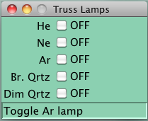 tlamps on|off 1|2|3|4|5 : Turns truss lamps on/off, Lamp1=He, 2=Ne, 3=Ar, 4=Br.Qrtz, 5=Dim Qrtz