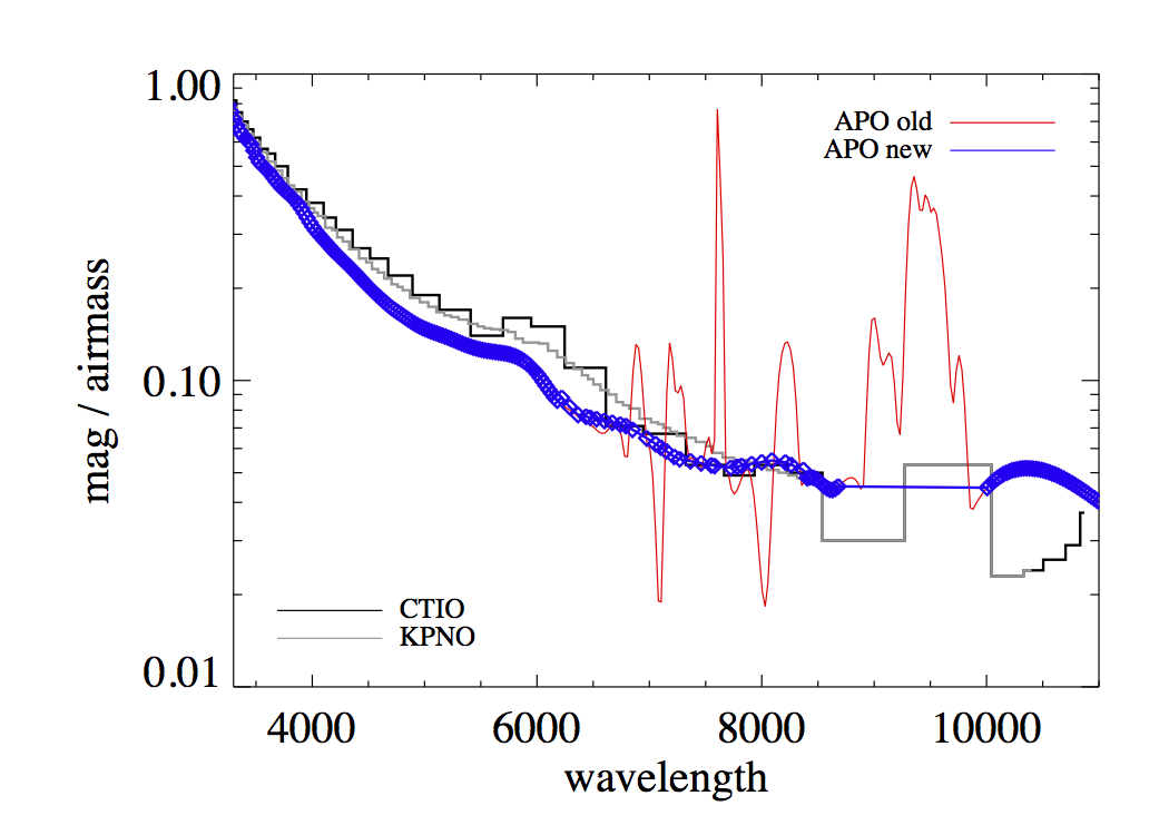 5. Flux calibration can be performed if required/desired using observations of spectrophotometric standards. You will also want to correct for atmospheric extinction at the airmass of your object. A mean extinction curve for APO has been derived for the SDSS project. The data in units of magnitude per airmass can be found here. A plot of this data, also in magnitude per airmass, can be found here. You can also plot extinction using this data. Transmission units are in fraction of flux at an airmass of 1.