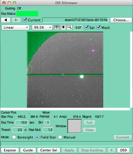 The slitviewer is also used for guiding during the DIS exposure. A common mode is to guide on the object in the slit, using the small amount of light that leaks out of the slit. This is done using Boresight guiding: select the Boresight radio button and then press Guide. It is also possible to find a star located in the slitviewer image away from the slit, put the X cursor on the desired guide star by clicking in the circle, then start guiding on it with Field Star mode selected. Field Star guiding will not work on an uncircled position marked by CTRL-click. Manual guide mode takes a loop of images and marks potentially usable objects on each image, but does not send any offsets to adjust the telescope position.