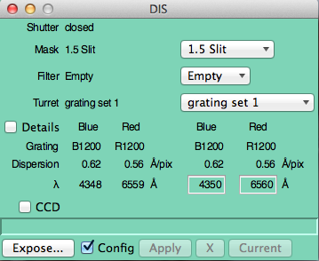 It is possible to change CCD windowing and binning in the DIS window by checking the CCD box. The CCD can be independently binned in either direction to change either the spatial scale, the dispersion (Å/pixel), or both. Binning might be advantageous if working in a readout noise limited regime where degradation of either spatial or spectral resolution is acceptable. With a slit length of 6 arcminutes, there are some unilluminated rows, so the file size can be reduced a bit by windowing the chip; you can window from (1:2048,101:950) without losing any data.