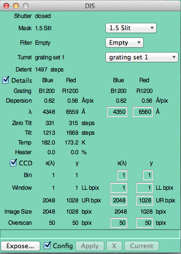 This window shows the current configuration (slit selection, grating selection, grating tilt/wavelength center, and CCD parameters. More details are available via the Details and CCD check boxes, and the configuration can be changed using the Config check box. As with other TUI windows, the Apply button must be hit to implement any selected changes and all current selections are applied upon click.