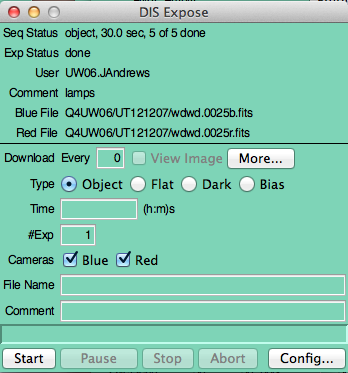 DIS exposures are taken using the Expose gui, which is opened using the Expose button in the DIS instrument gui. The Expose gui looks like this: