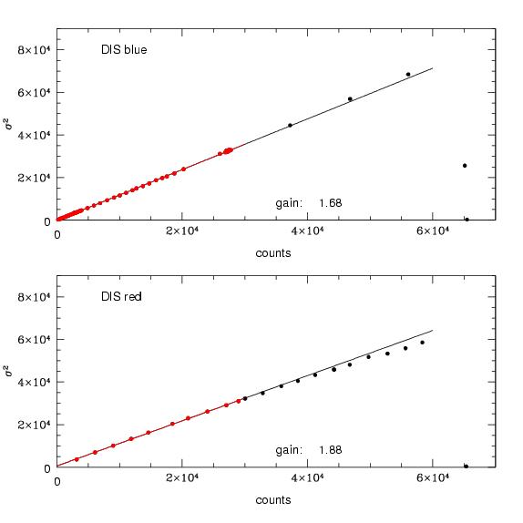 The light transfer test data above were obtained from a series of images taken during December 2006 and yield a gain of 1.68 electrons/DN in the blue channel and 1.88 electrons/DN in the red channel. The derived value of the gain changes slightly depending on what region of the curve is being fit. There is also always the possibility that the gain may vary slightly with time.