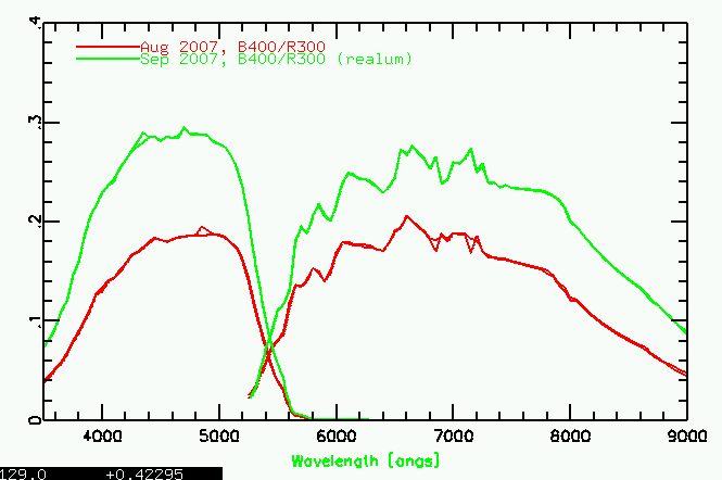 This plot demostrates instrument throughput before and after realuminizing the primary mirror. This should give users a feel for how much of the throughput is in the instrument and how much is in the telescope. Aside from the grating response, there is some vignetting within the cameras that leads to a reduction of throughput towards the edges of chips. As a result, the throughput for the higher resolution gratings will depend to some extent on their tilt, e.g. the chosen wavelength center. In the blue, we only have the single B1200 high resolution grating. In the red, we have both R1200 and R830; the R1200 has superior throughput at the shorter wavelength end of the red channel, while the R830 has superior throughput at the longer wavelength end, with a crossover somewhere around 7500 A.