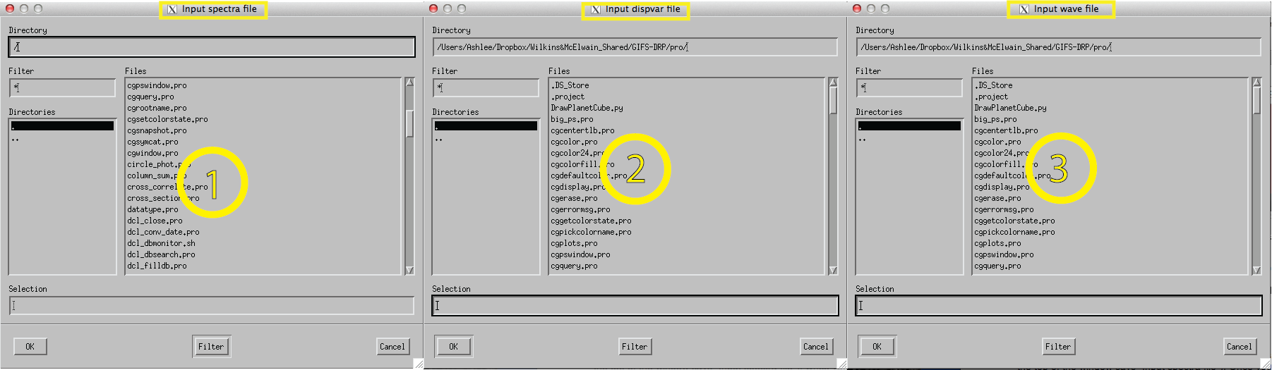 - You will immediately be prompted to enter a file name in a series of three windows, shown in Figure 4. First, you'll put in the SCIENCE_SPECTRA file (notice that the top of the window says "Input spectra file"). Once you press "OK," a second window will pop up, into which you'll put in the DISTORTION file (notice that the top of the window says "Input distortion file"). Once you press "OK," a third and final window will pop up, into which you'll put in the WAVE file (notice that the top of the window says "Input wave file").