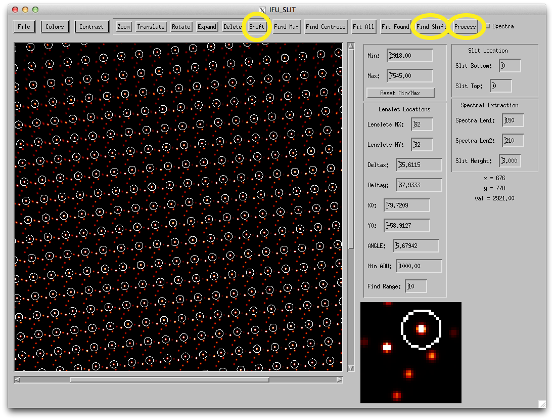 - Use the "Shift" button to fine tune the location of the circles (representing apertures to fit the lenslets positions) such that they best line up with the bright spots, as shown in Figure 6. The REF_GRID file may provide a good match to your data, which would then require no additional shifting of the apertures. DO NOT use the "Translate" button for this task.