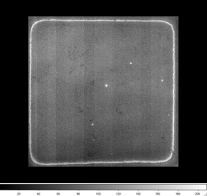 The detector as tested by Rockwell demonstrates a mean quantum efficiency (QE) of 73.0% in J band and 81.9% in Ks band. H-band QE is approximately mid-way between these values on the typical H1RG.)  Reference pixels which are not light sensitive make up the outer four rows/columns of pixels, making the active region of the FPA 1016x1016 pixels.  Overall pixel operability as reported by the vendor is 98.41%, with 1.56% reference pixels and 0.03% inoperable or "bad" pixels. The small number of bad pixels (275 total, with 33 hot/138 dead) are easily removed by median-processing a dither pattern.