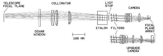 NICFPS reimages the telescope focal plane using cryongenic optics; it has three filter wheels hosting a set of 4 broadband and 12 narrow-band filters, plus a filter mask for dark frames. A Lyot stop is positioned in the telescope pupil plane. The cryongenic etalon can be positioned into the optical path for the Fabry-Perot mode (but has not yet become fully operational). The detector is a Rockwell Hawaii 1-RG 1024x1024 HgCdTe device with a 0.273 arsec/pixel scale and 4.58 arcmin sqaure, unvignetted field, and sensitivity from 0.85 to 2.4 microns. The instrument is designed for high throughput and 2 pixel (at 2 microns) sampling under good seeing conditions (~0.5 arcsec) at Apache Point.