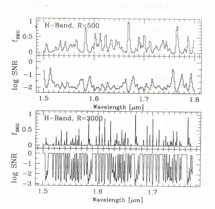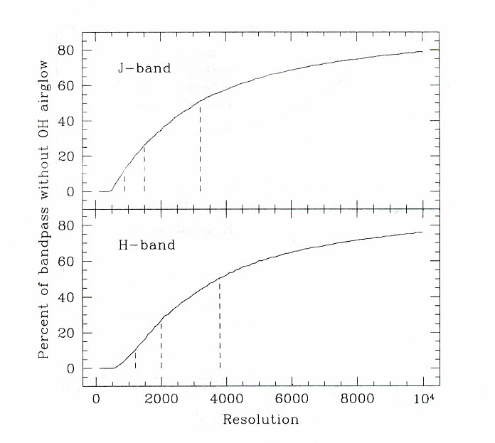 Due to the substantial airglow across the TripleSpec bandwidth there is a sensitivity penalty in addition to the resolution penalty incurred when using wider slits. The airglow lines become broader thus covering more of the spectrum. More flux is admitted into the instrument overall yielding more scattered light. If seeing allows, the 1.1 arcsec slit is optimal for observation. Although the 0.7 arcsec slit is even better in this regard, it subtends only 1.5 pixels and is undersampled. The figures below graphically illustrate the improvement in uncomtaminated spectral coverage vs. resolution.