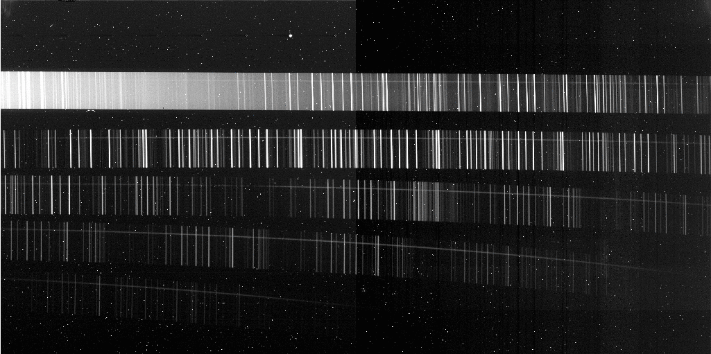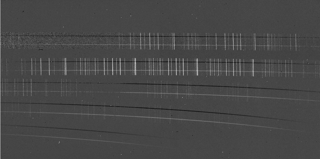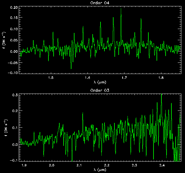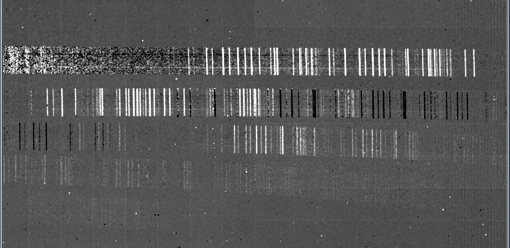Electronic ghosting: The most evident feature is the electronic crosstalk that appears when a bright source fills many rows/columns in one of the two array quadrants. This effect is most evident for the bright K-band order where emission filling the rows in in the left-hand quadrant produces an electronic ghost appearing as a vertical stripe of constant intensity in the right-hand quadrant. At a lower level, some of the bright spectral lines on the right-hand quadrant produce electronic ghost lines that cross the entire left-hand quadrant at constant intensity.