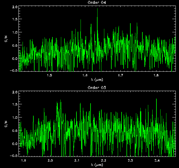 Unlike visible wavelength spectroscopy, substantial airglow dominates the near-infrared portion of the spectrum, particularly at wavelengths longward of 1.5um. Beginning at 2.0um and longward a significant ambient thermal radiation component begins to contribute Poisson noise. The spectrum below illustrates these effects on a faint (J, H, Ks ~ 14 mag) object. The animation shows the star observed at two slit positions as is typical for TripleSpec observations. Evident are bright airglow emission lines filling the slit, particularly in the H-band (2nd from top) order. Wavelength increases to the left, and the rising thermal emission in the K-band order (top) is evident as well. Scattered high dark current pixels pepper the array. Pixels that blink on are off are cosmic ray hits. The exposure time for this image is 120 seconds.